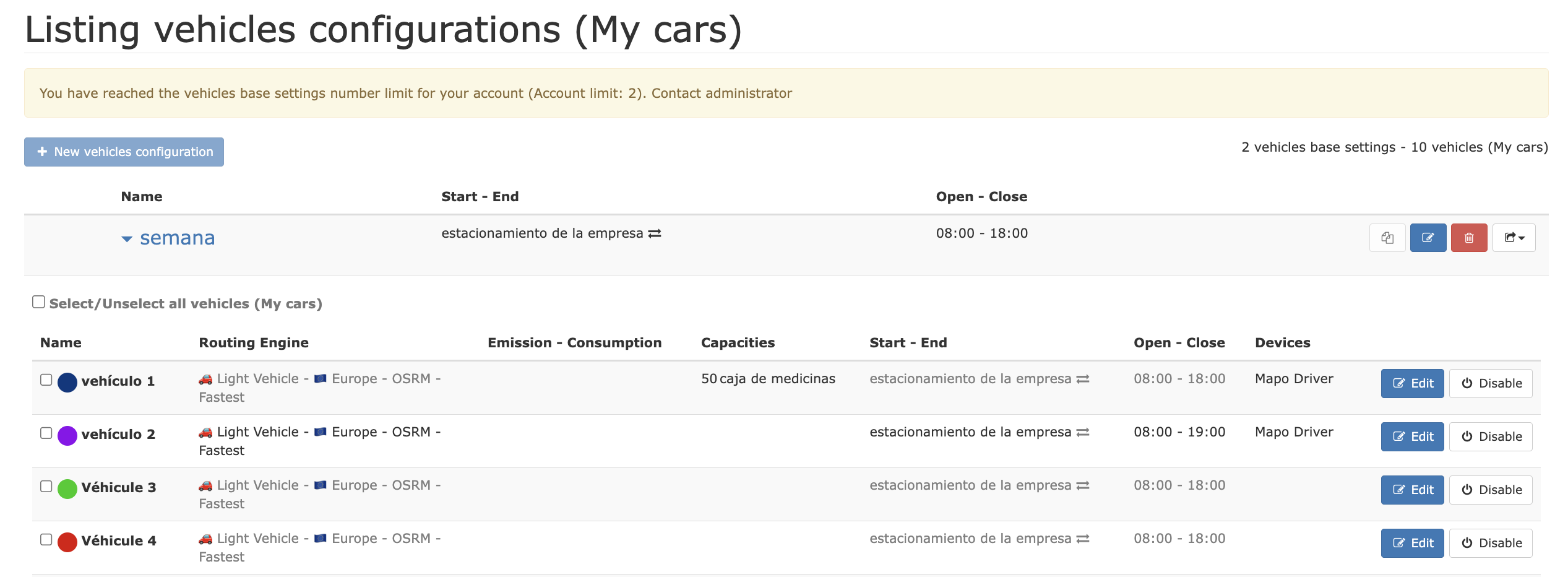 To edit vehicles configuration, click on “Edit” button on the correct vehicles configuration.