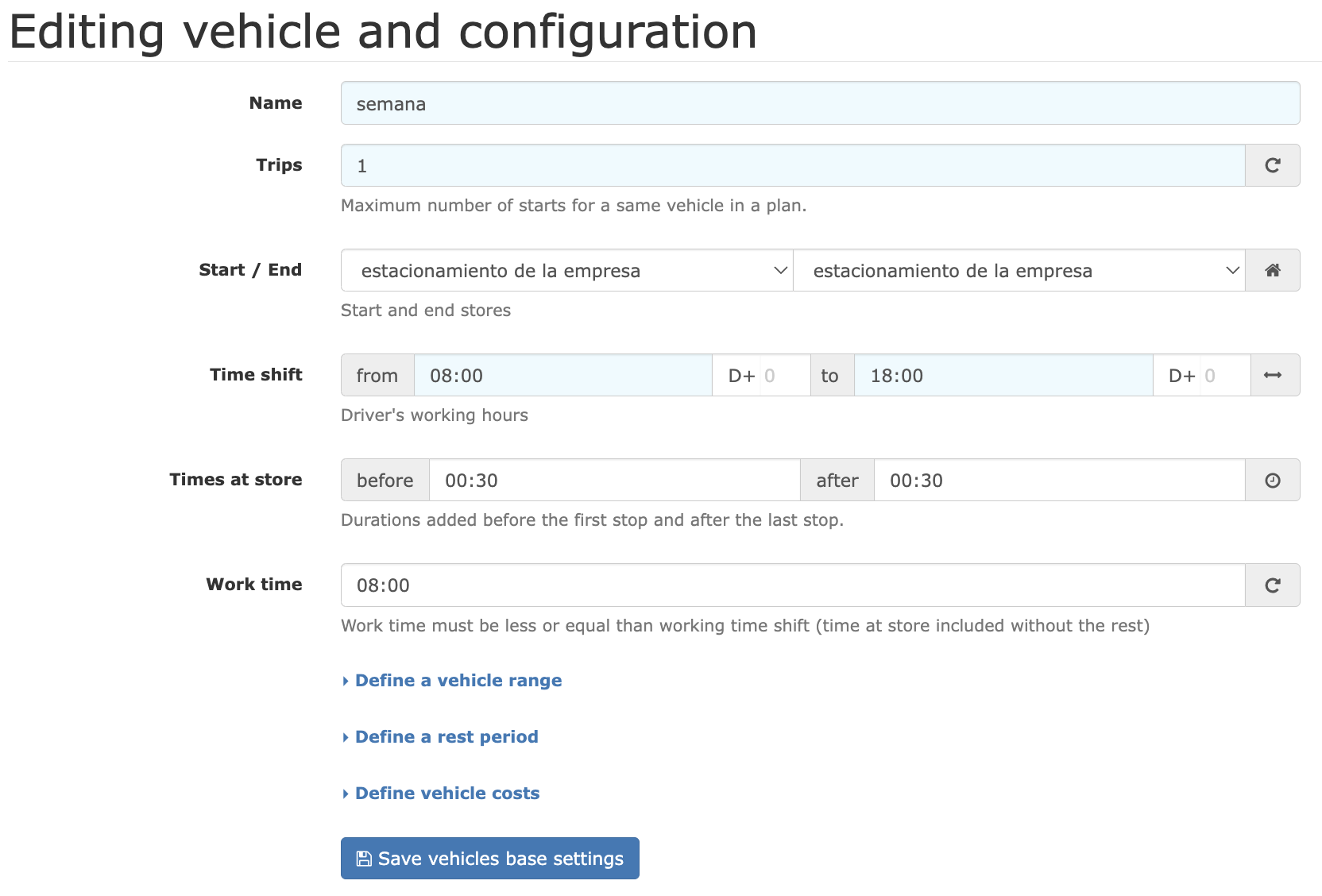 On “Vehicles” page > “List”, click on Duplicate button . The duplicated configuration has between brackets the date of creation. Clicking “Modify”, the configuration page allows to Edit vehicles configuration.