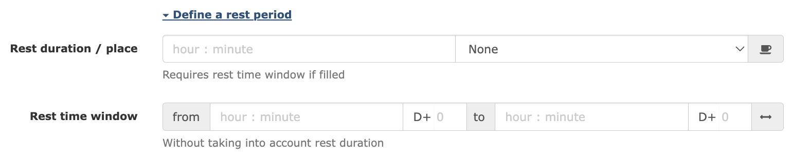 Rest time window (departure/arrival): between which hours the rest can be taken (example: from 13:15 to 14:00, means that the rest period should start between 13:15 and 14:00).