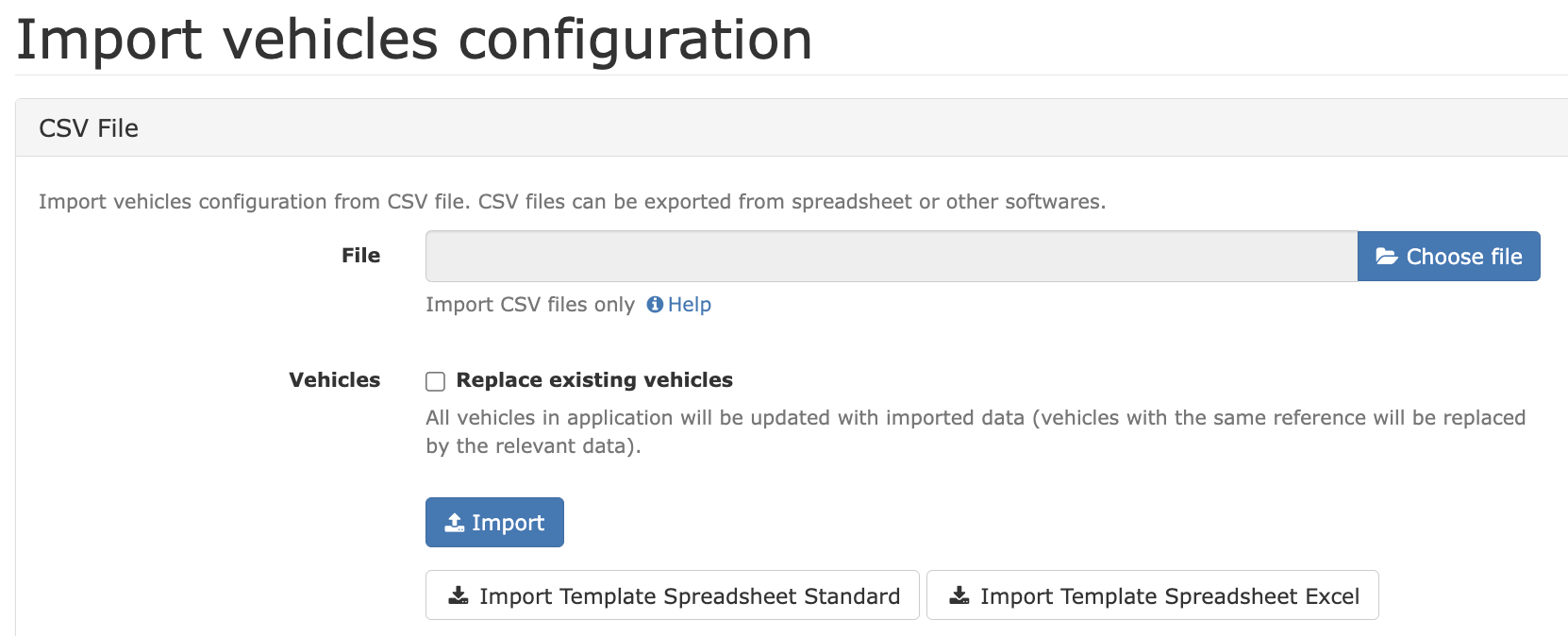 Replace existing vehicles : Check to update existing vehicles (unchanged vehicle reference) and add vehicles configurations. Leave blank to add the configuration without modifying the existing vehicles.