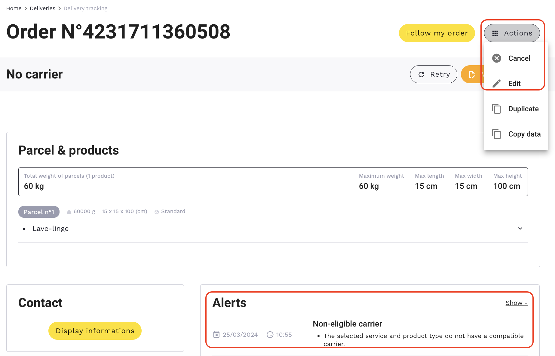 To make modifications manually, click on ‘Actions’ → ‘Modify’ from the order detail section.