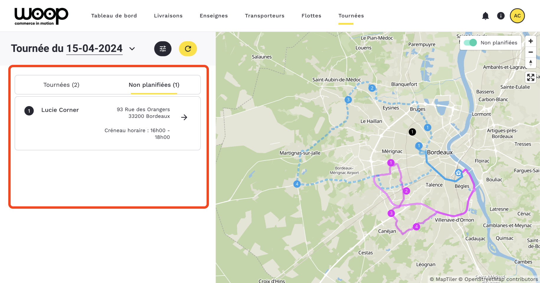 In the "unplanned" tab, you can view the list of deliveries scheduled for that day but not positioned in a route.