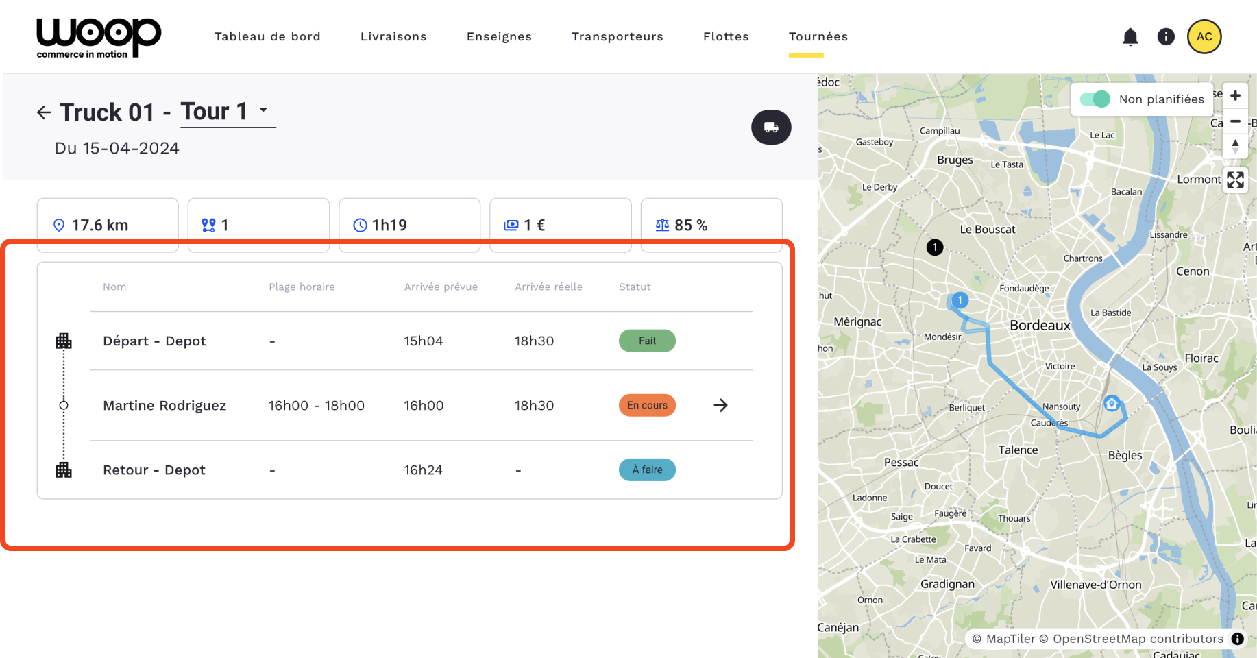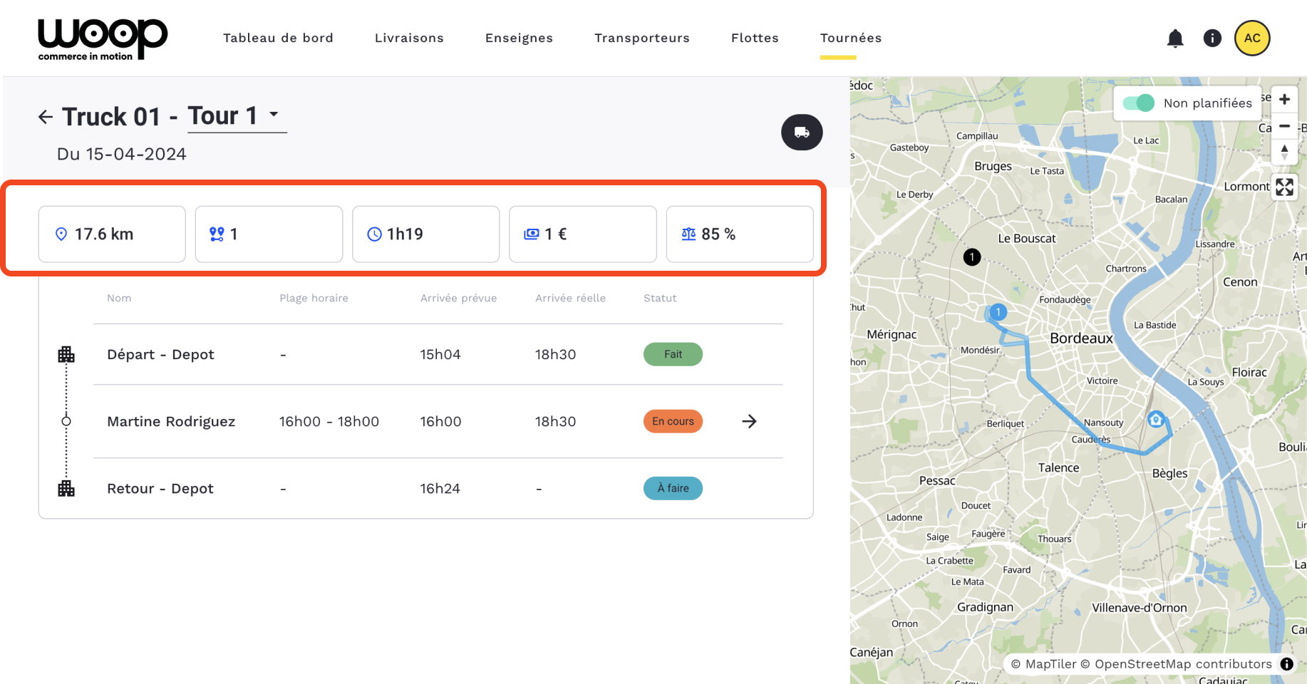 In the map view, find all the routes planned for that day, as well as unplanned deliveries. The itineraries follow the vehicle's set colour. Clicking on a stop displays a box with essential information about this delivery and highlights the route to which it belongs.