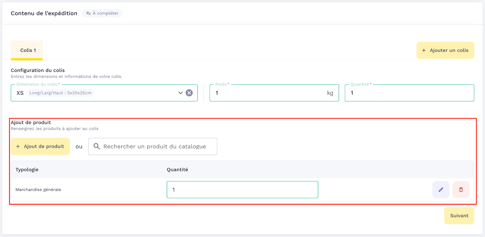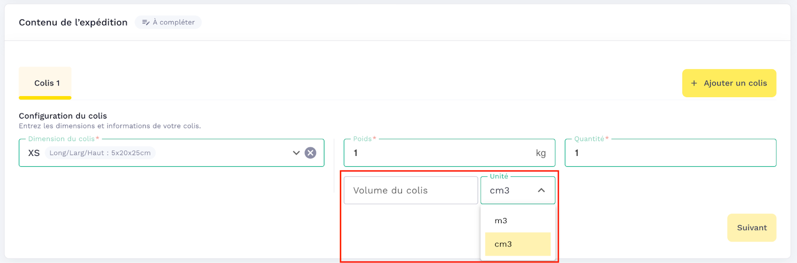The parcel volume allows you to add a field corresponding to the volume of the parcel and a dropdown menu to choose the corresponding unit.