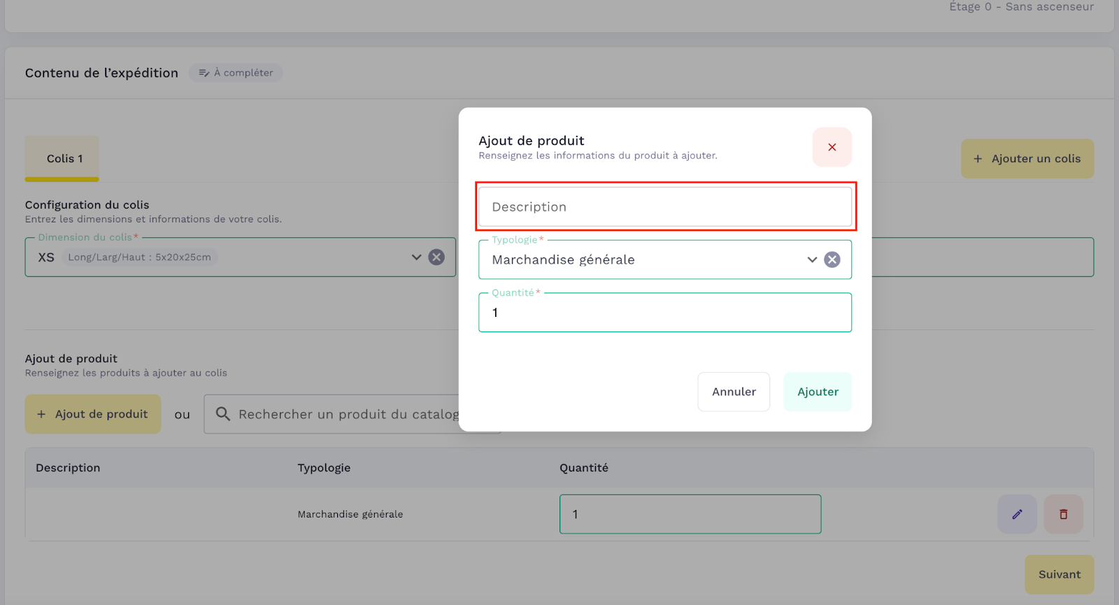 The floor space allows you to add a field corresponding to the area occupied by the parcel on the floor and a dropdown menu to choose the corresponding unit.