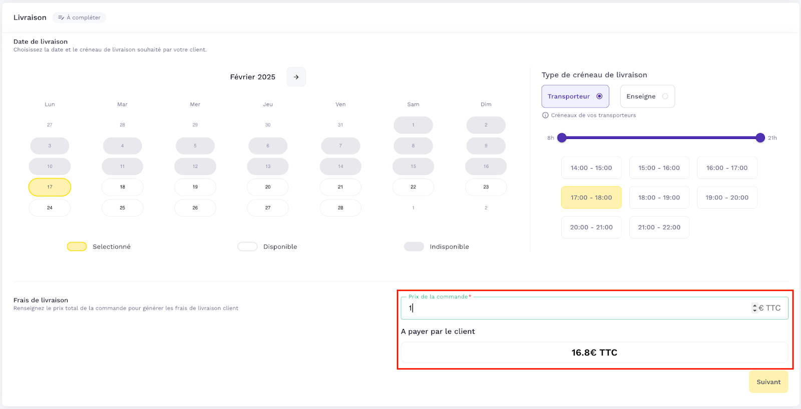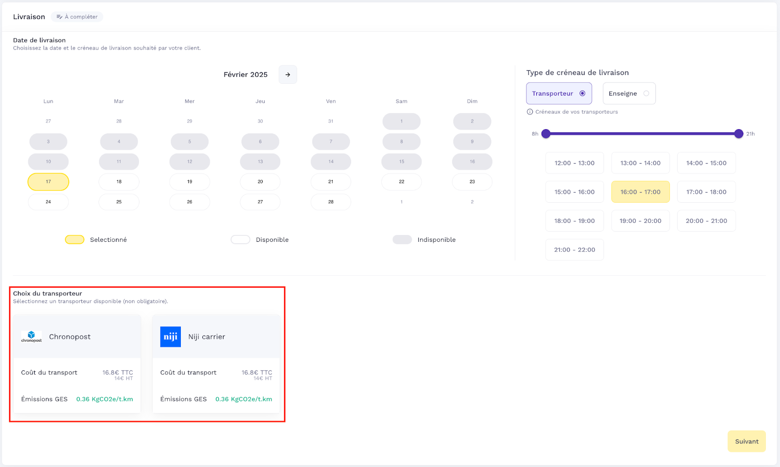 The carrier choice option allows you to add the possibility to choose one of the proposed carriers when a slot is selected among the eligible carriers.