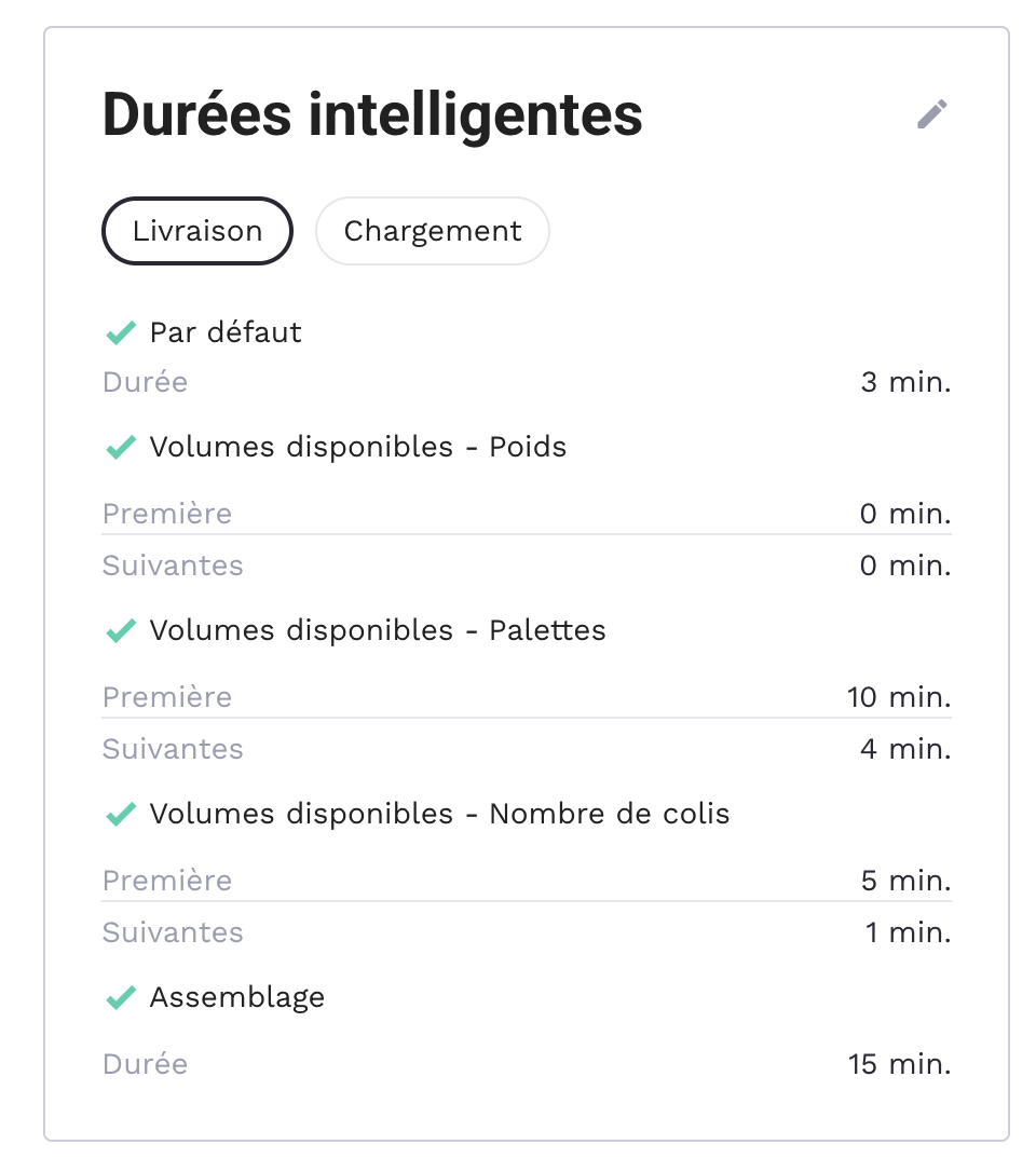 Smart durations automatically adjust the time spent on loading and delivery based on your settings.