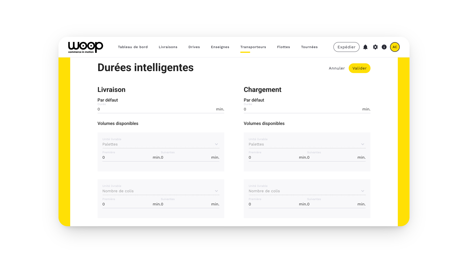 Each time you receive a new mission, Woop calculates, based on your settings, the time required for its loading and/or delivery.