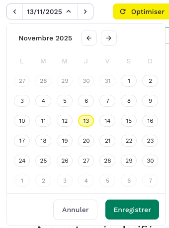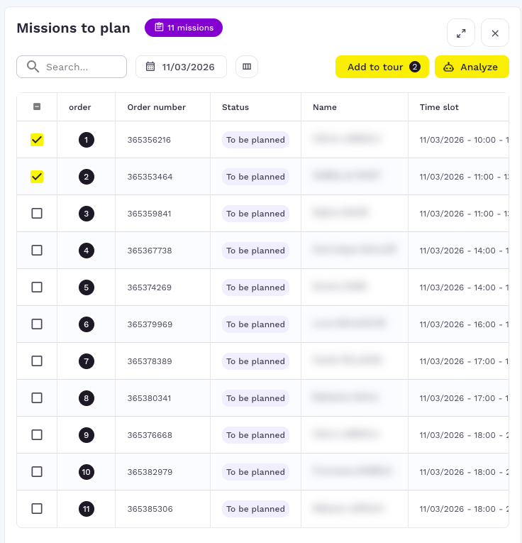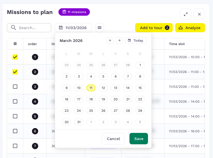 Customising columns: You can tailor the "Missions to schedule" table to your needs using the column customisation button (located to the right of the date selector).