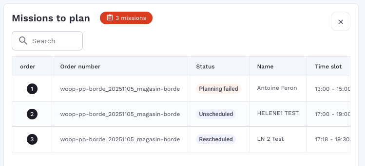 - Search for a mission to be scheduled: The search field lets you find a mission by order number, status, customer name or first name, time slot, or delivery address.