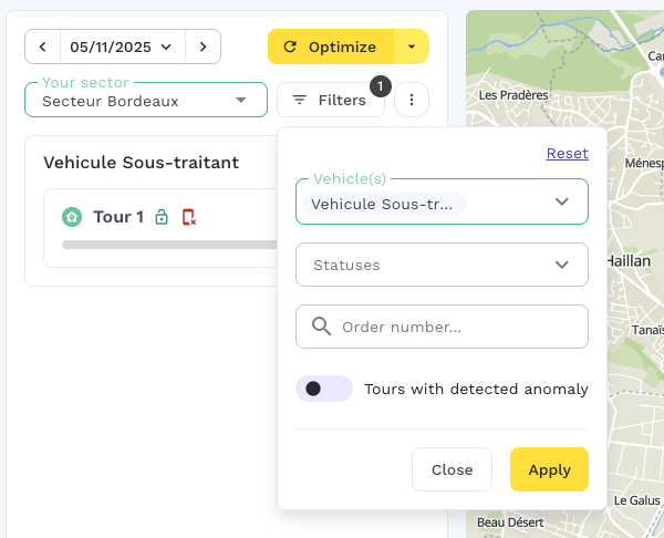 - Filter today's routes: You can filter the display of routes by vehicle, status, order number, or by routes with anomalies