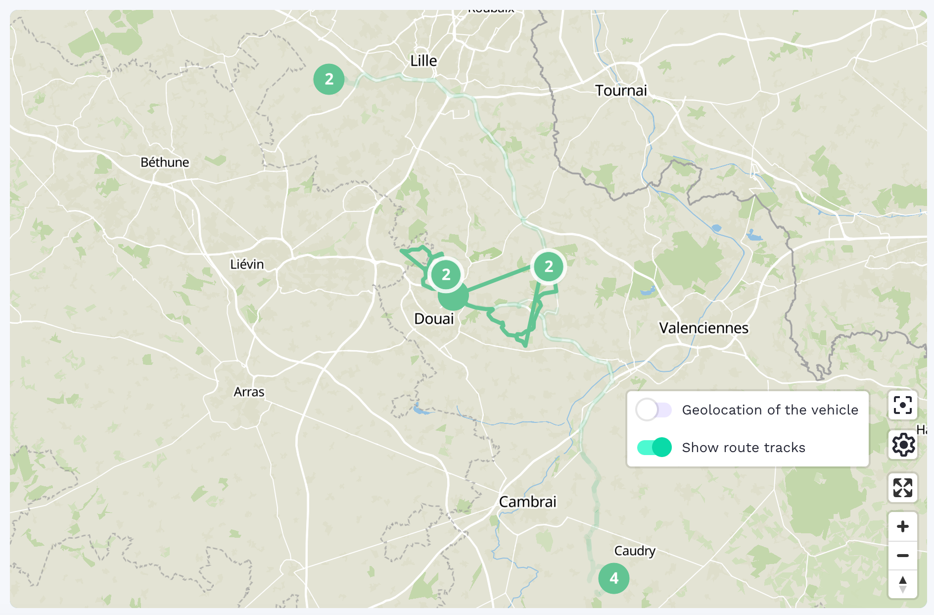 The completed route: shows in real time the actual itinerary taken by the vehicle during its route. This can be activated via the settings icon (cog) on the map.