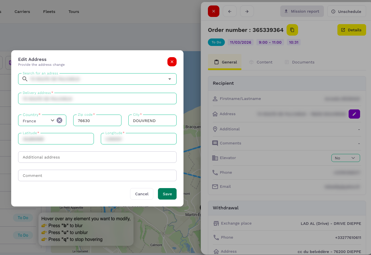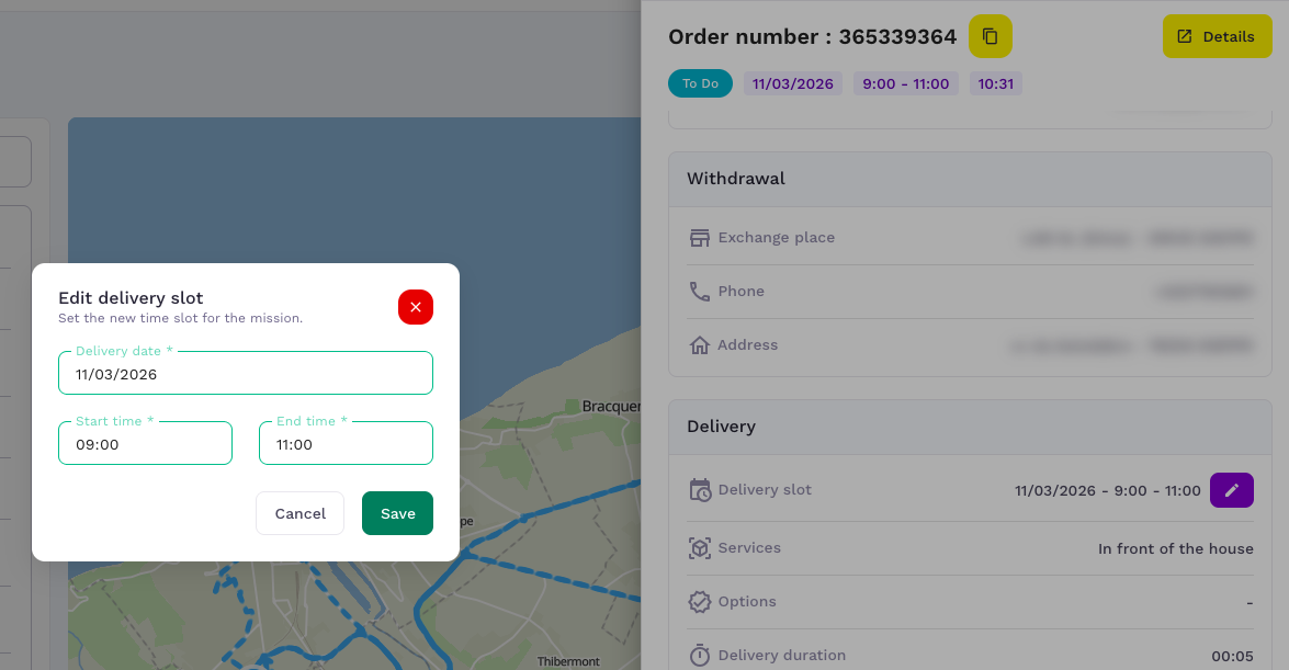 - Edit address and time slot from the side panel. The “Edit” buttons are only visible if the “Edit route” permission is enabled on the user account.