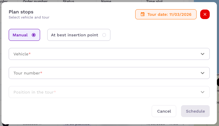 When you click the "Schedule" or "Add to route" button, you can choose a vehicle, a route number or a new route, and the position within the route.