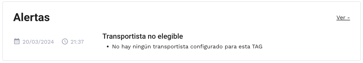Para conocer los motivos del rechazo, ve al bloque «Alertas». Aquí se encuentra el motivo de rechazo «Transportista no elegible»: