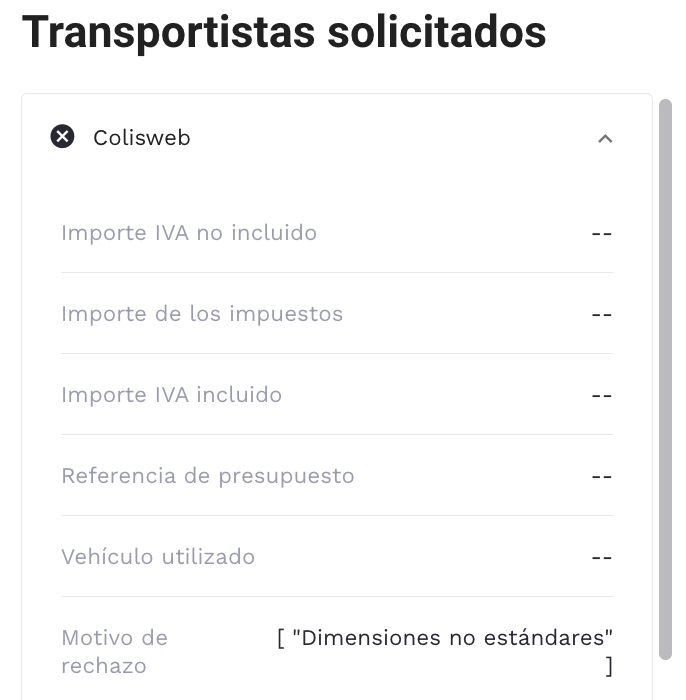 Este estado significa que se ha contactado con transportistas, pero ninguno ha aceptado elaborar un presupuesto para el trayecto. Para conocer los motivos de rechazo, puedes ir a la sección «Transportistas solicitados» y hacer clic para ver el motivo del rechazo:
