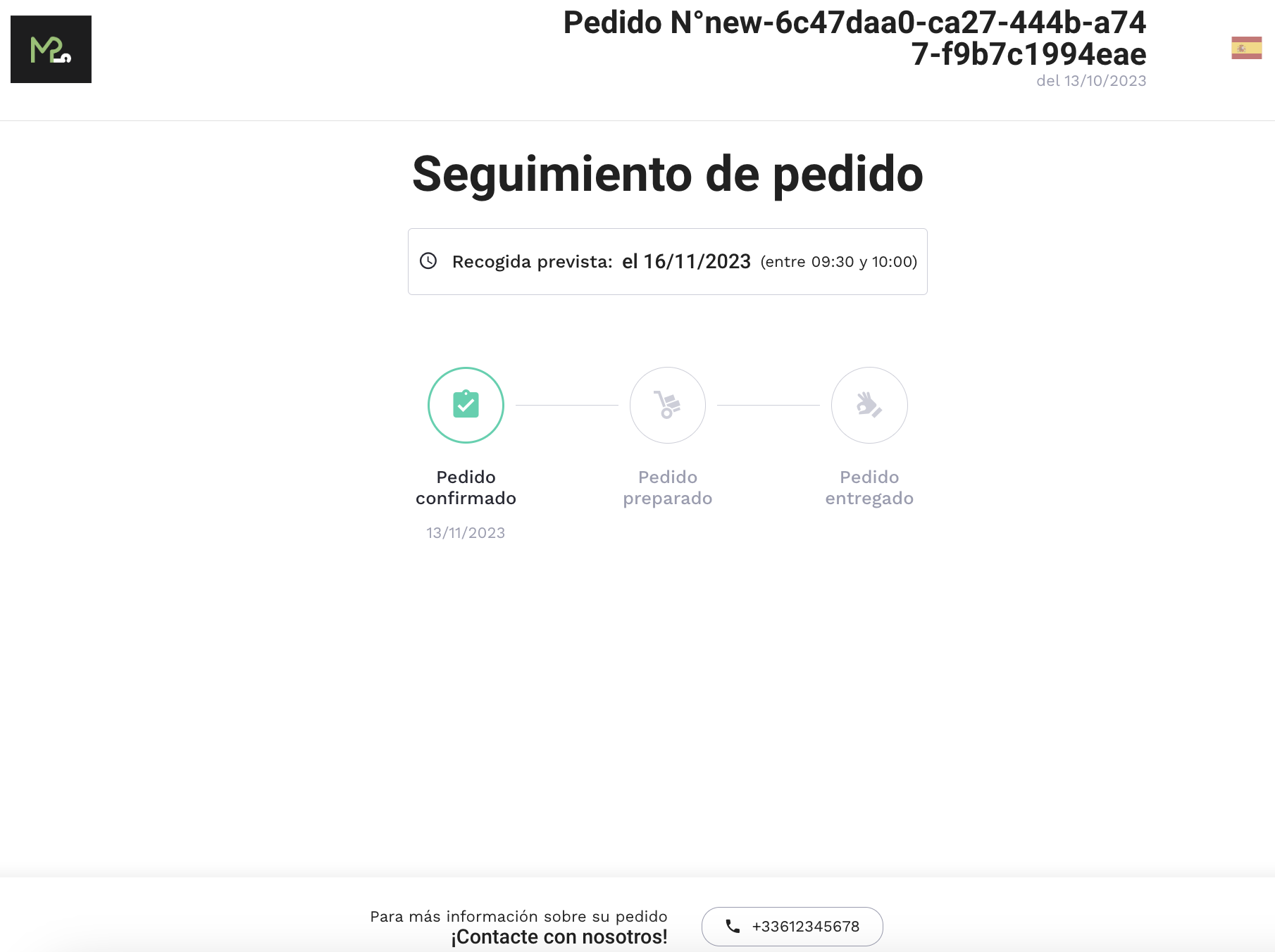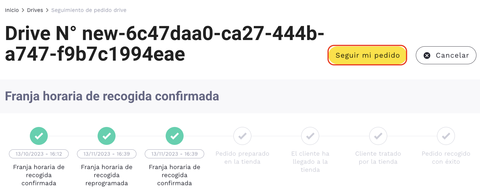- Seguimiento del pedido: El botón «Seguir mi pedido» (arriba a la derecha de su pedido) le permitirá seguir el avance de la recogida desde el estado de «pedido confirmado», «pedido preparado» y «pedido entregado».