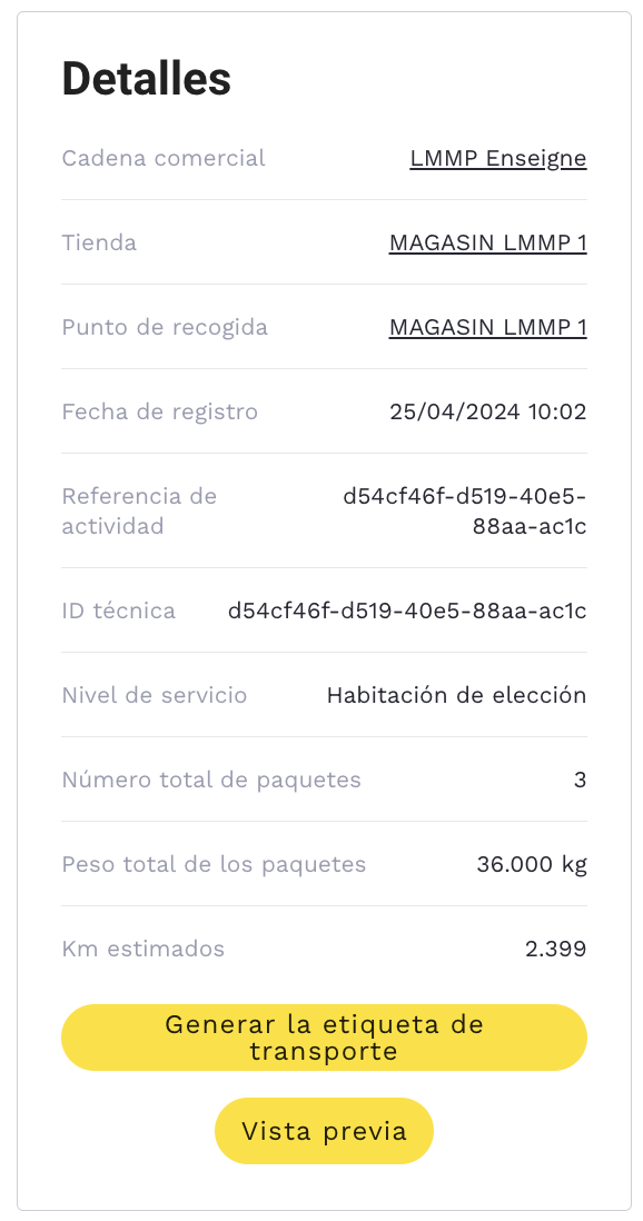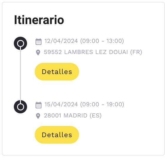 - Itinerario: Indica los lugares de salida y llegada del pedido y permite mostrar los datos de contacto de salida y llegada.