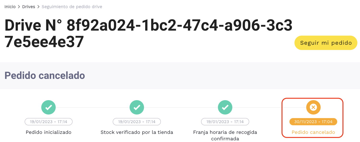 Si la cancelación es posible, se mostrará el estado «Pedido cancelado» en la línea temporal: