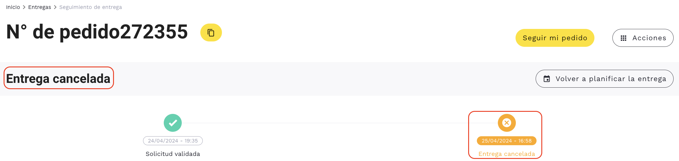 Si la cancelación es posible, se mostrará el estado «Entrega cancelada» en la línea temporal.