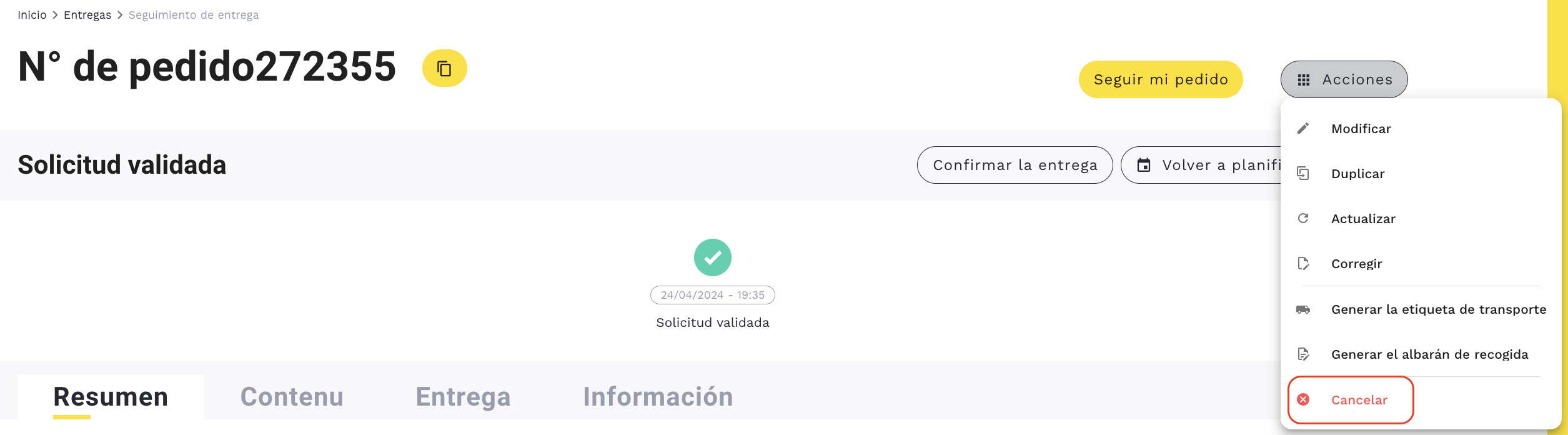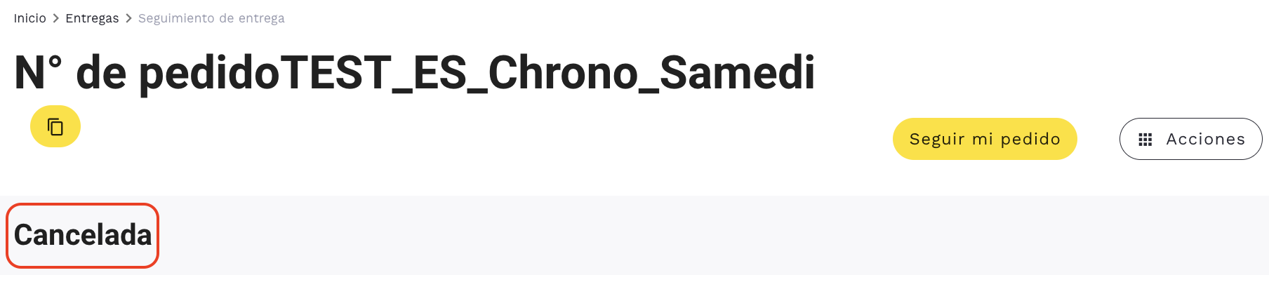 Si lo deseas, puedes volver a cancelar el pedido haciendo clic en «Cancelar» desde «Acciones».