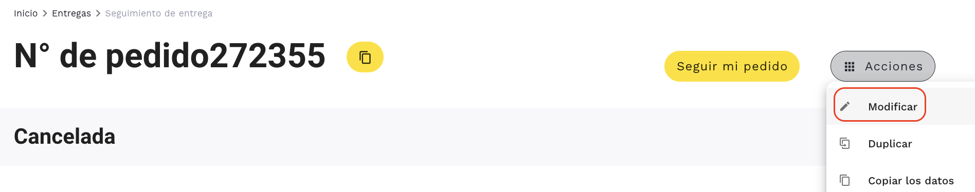 Puedes cancelar un pedido desde la página de detalles del pedido.