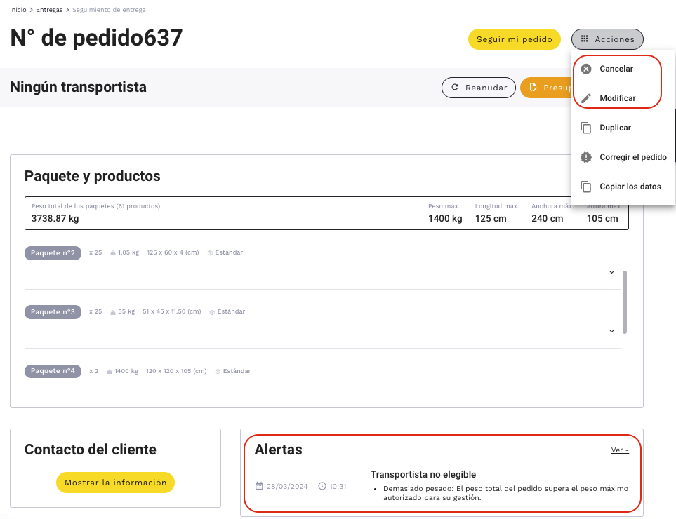 - - el pedido supera la capacidad del transportista