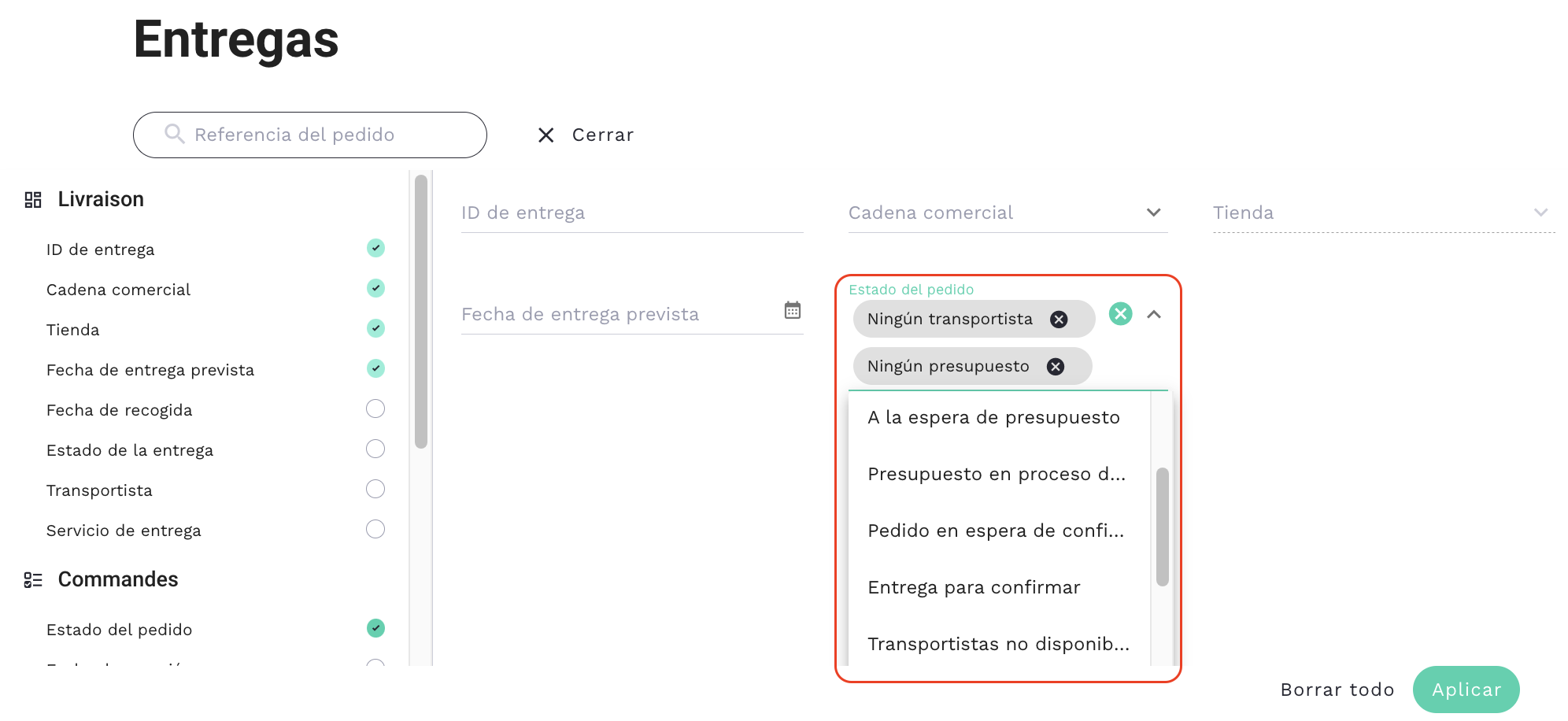 En el ejemplo siguiente, se han agregado dos estados de incidente de pedido al filtro: «Ningún transportista» y «Ningún presupuesto».