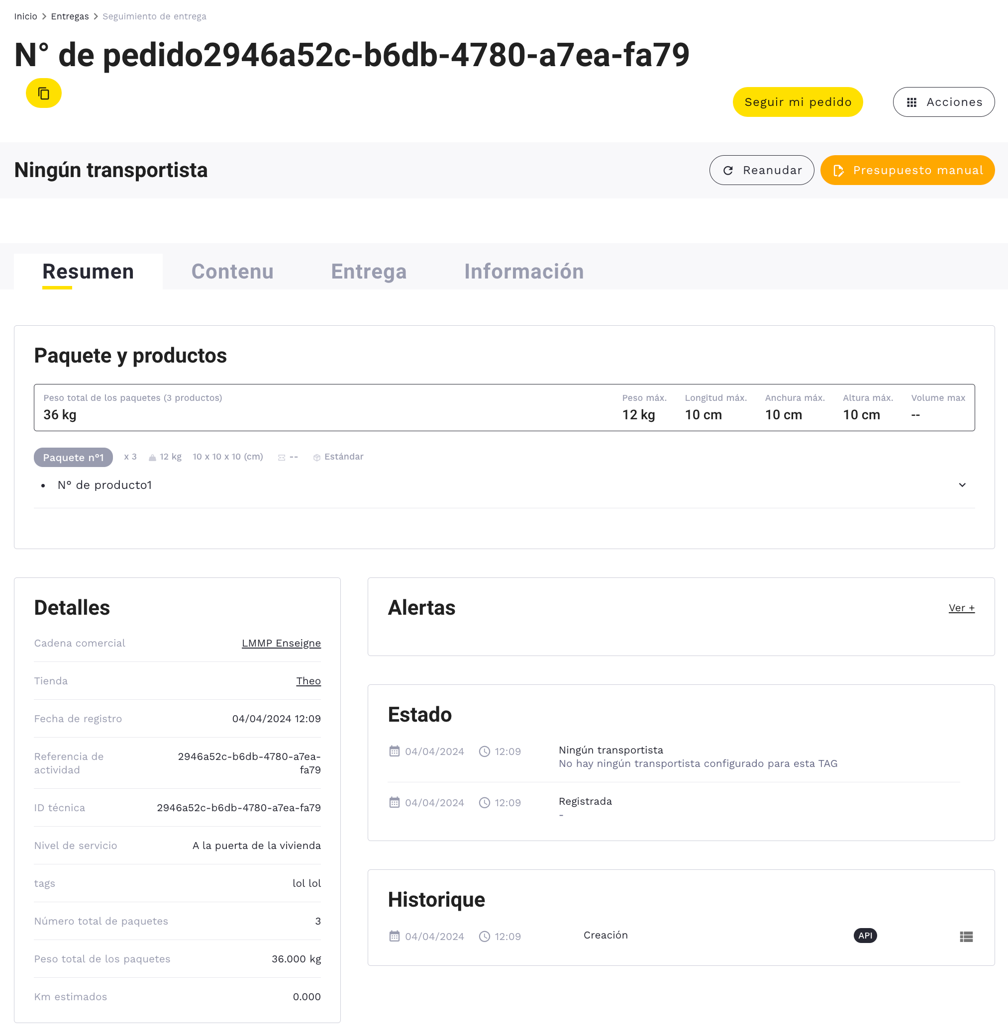 Al hacer clic en una alerta de la ventana emergente anterior, se te redirige a la página correspondiente al pedido (situada en la sección «Entregas»).