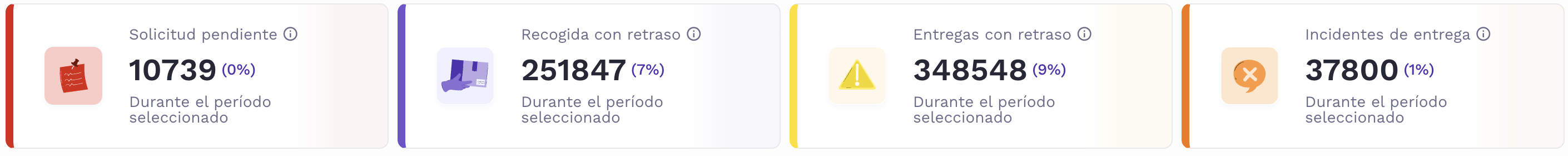 - Incidentes de entrega: Este indicador muestra el número de entregas en estado de fallo. Incluye fallos de recogida, fallos de entrega, entrega bloqueada, entrega retrasada.