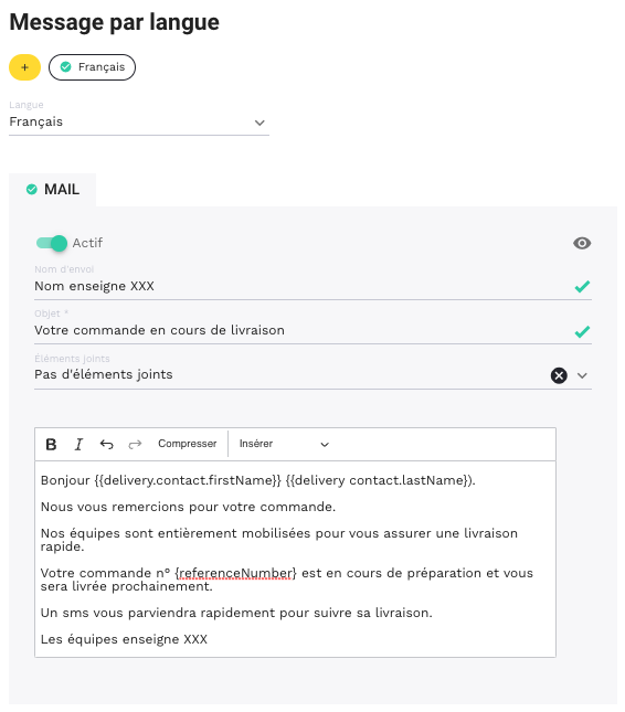 L'enseigne peut insérer sont propre template HTML pour configurer une de ses notifications par e-mail.