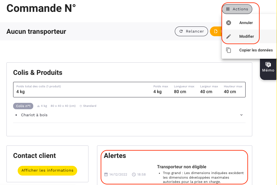 Pour apporter les modifications manuelles, il faut cliquer sur « Actions » → "Modifier" depuis le détail d'une commande.