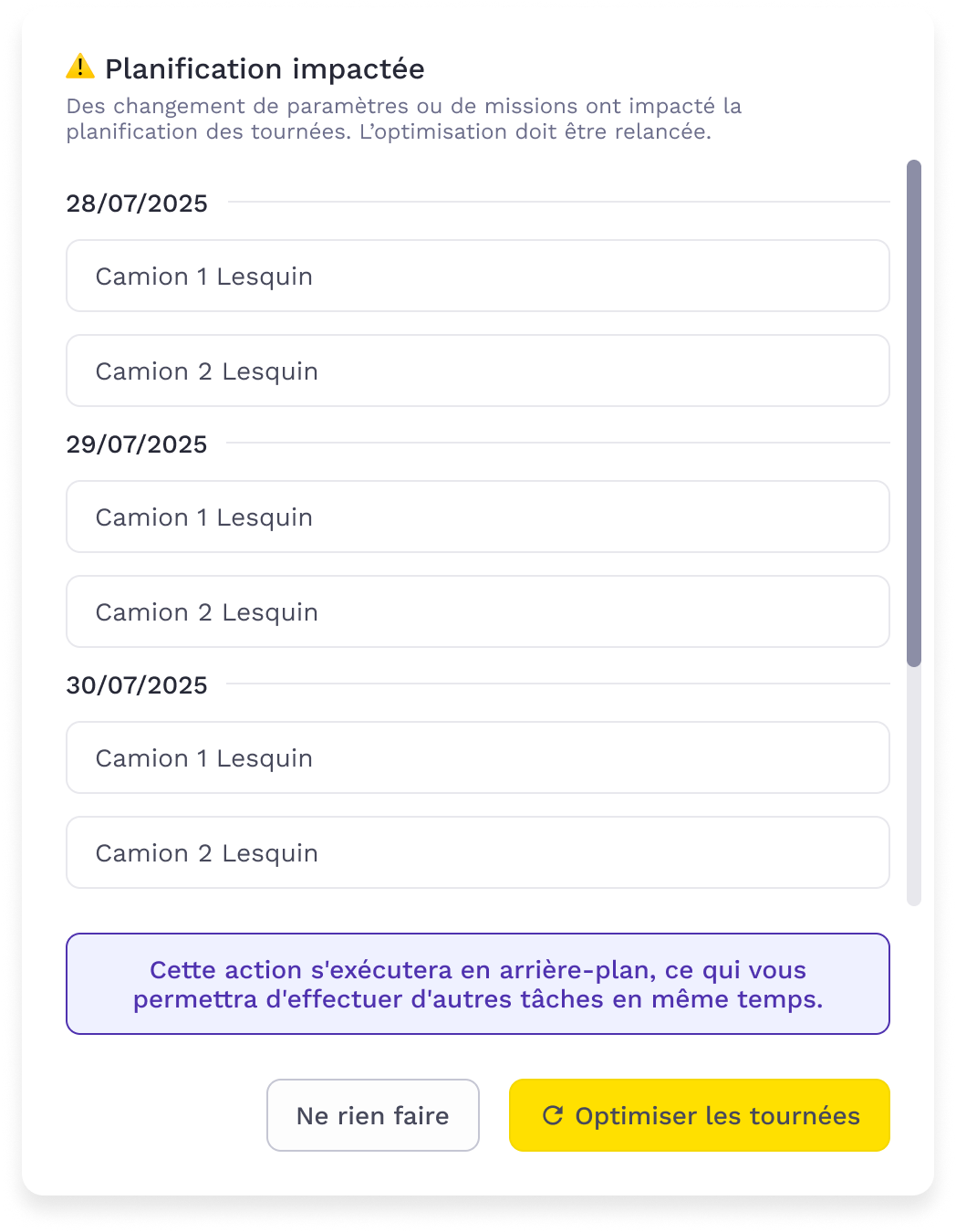 Lorsque des tournĂ©es sont impactĂ©es par des changements externes (modification d'une date de livraison, changement d'un paramĂštre vĂ©hicule ou agent...) il peut ĂȘtre nĂ©cessaire de relancer leur optimisation. Pour vous permettre de facilement les identifier et pouvoir relancer en masse sans perte de temps, une fenĂȘtre s'ouvre dĂ©sormais automatiquement quand des tournĂ©es concernĂ©es sont dĂ©tectĂ©es par le systĂšme.