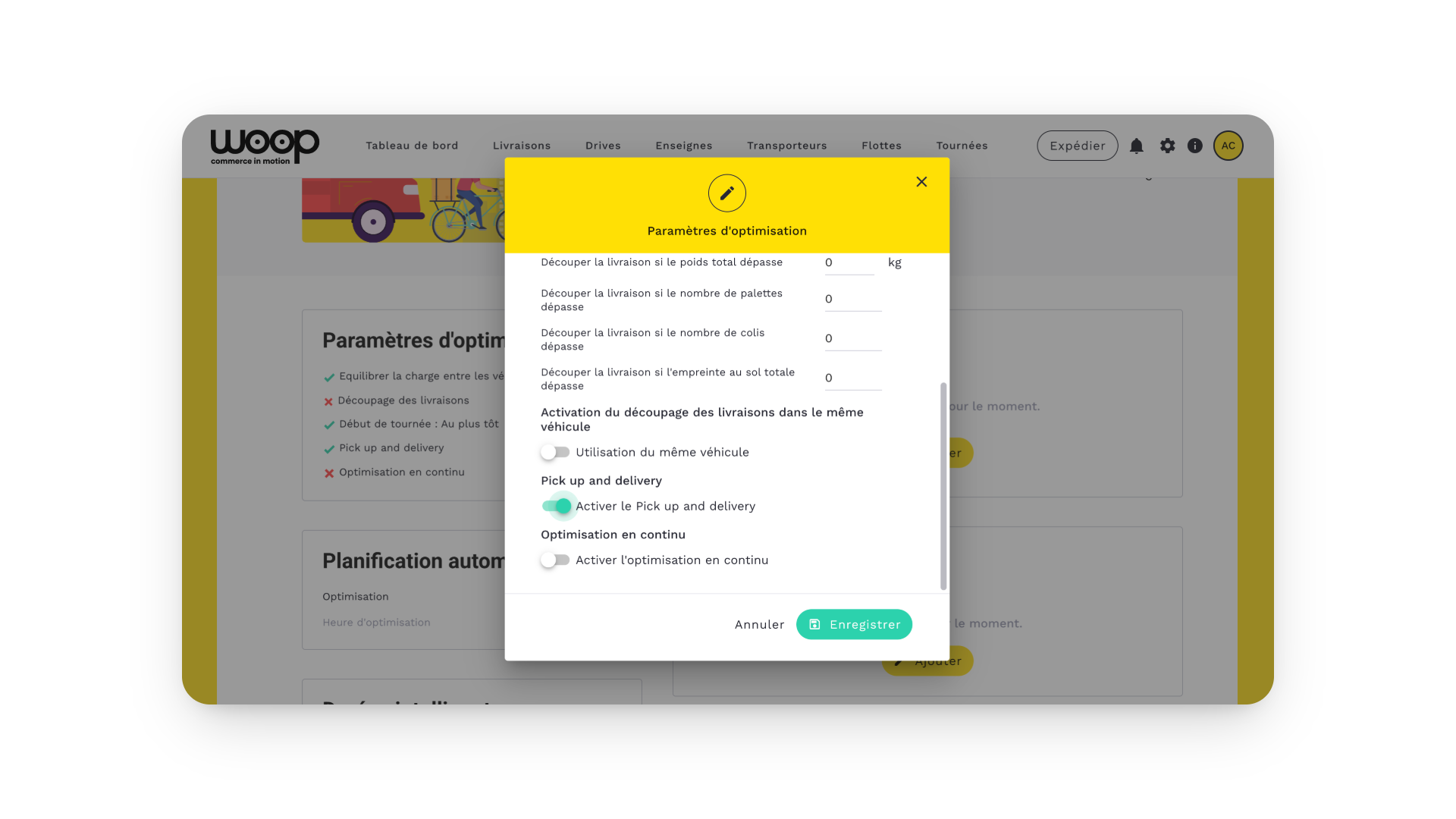 Pour activer ou désactiver le pick up and delivery, ouvrir les "paramètres d'optimisation" et modifier le paramètre "pick up and Delivery".