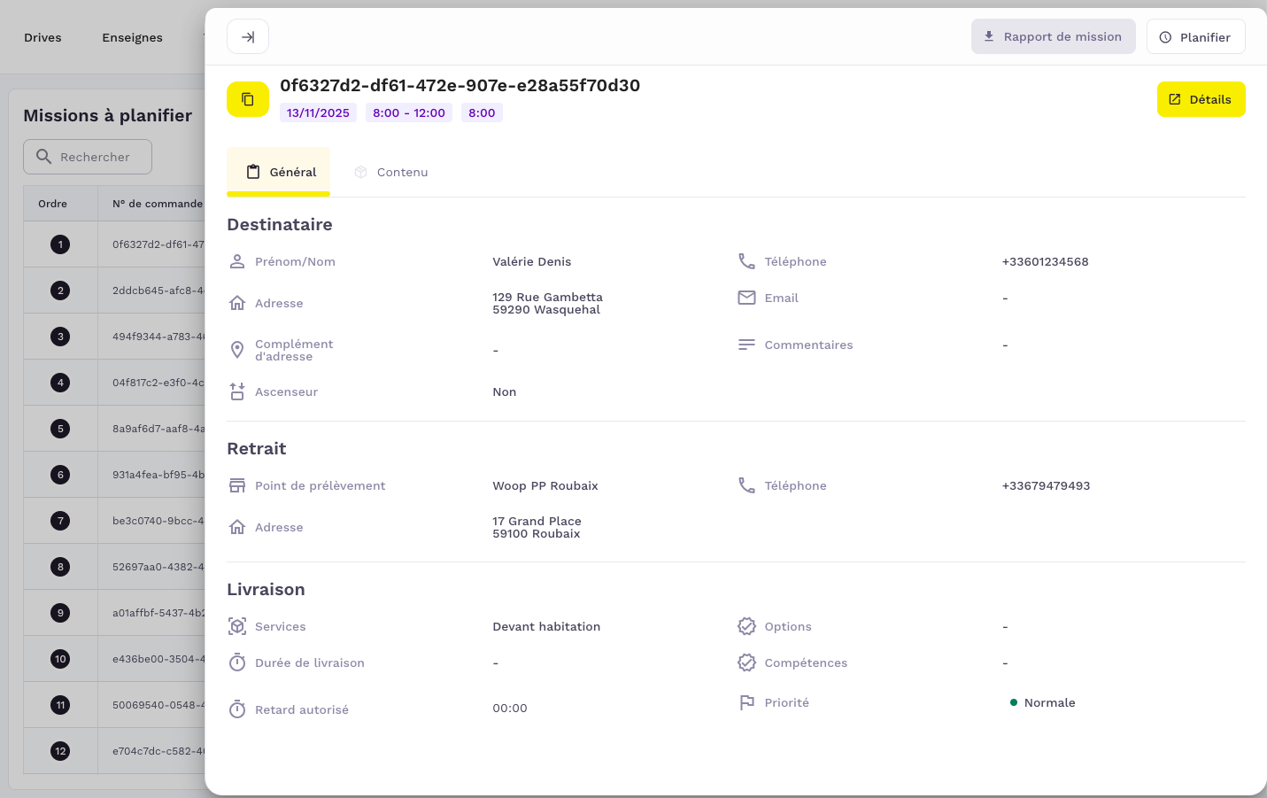 DĂ©tail de mission Ă planifier : Pour consulter le dĂ©tail dâune mission , cliquez sur le n° de commande  dans le tableau des missions Ă planifier . Le dĂ©tail sâouvre dans un volet latĂ©rale.Â