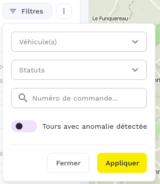 - Filtrer les tournées du jour : Il est possible de filtrer l'affichage des tournée par véhicule , statuts , numéro de commande ou par tournée avec anomalies