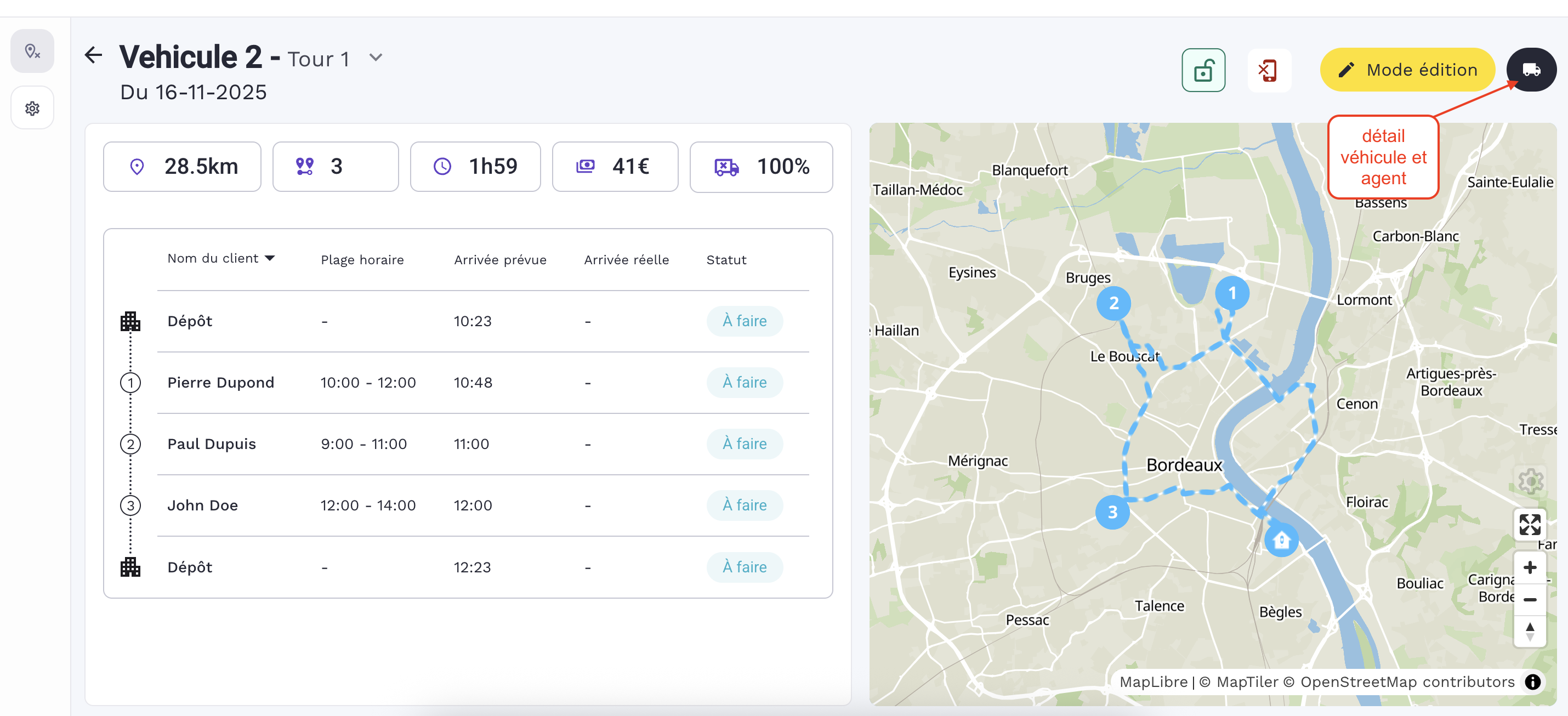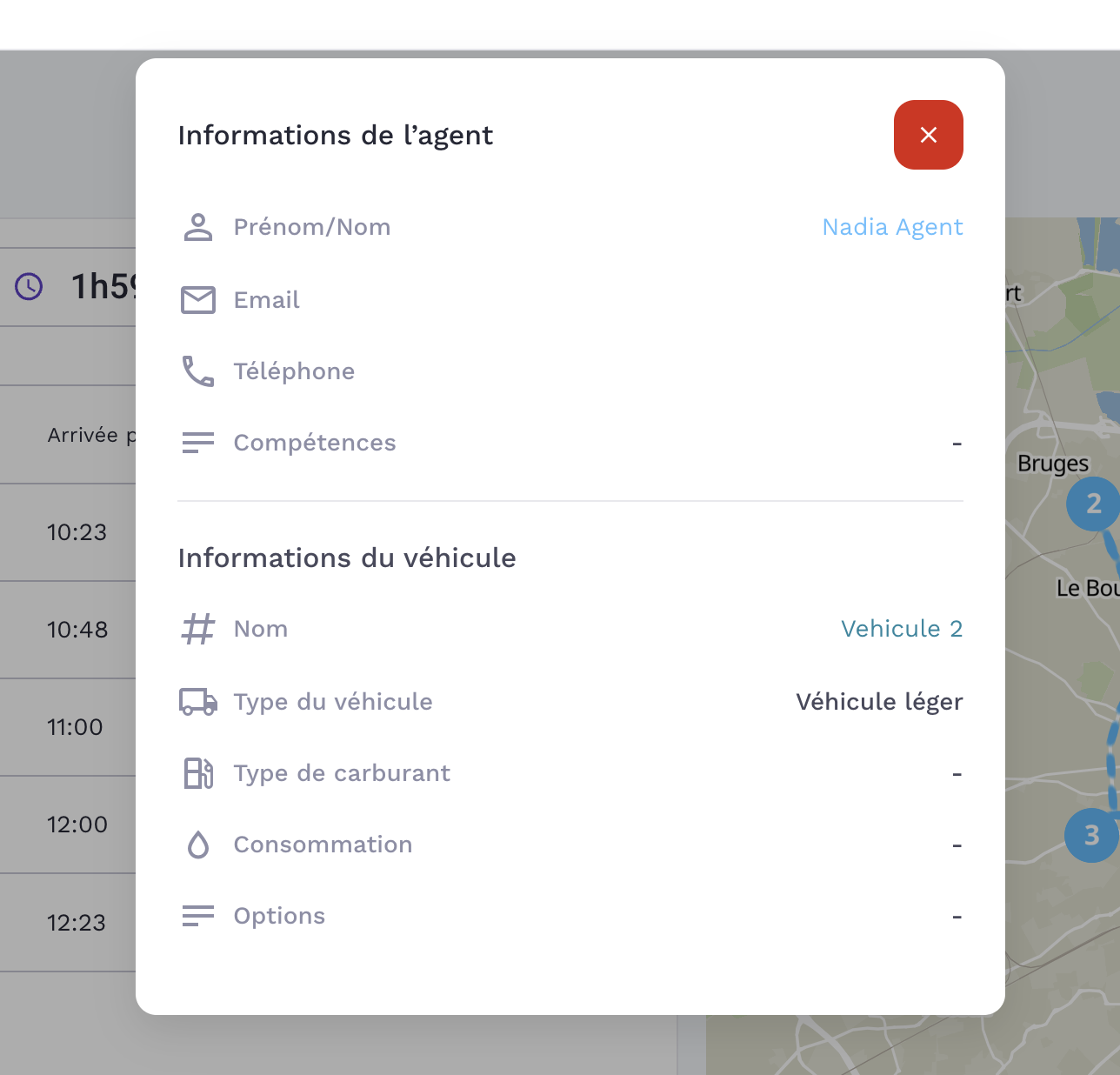 Depuis le dĂ©tail de la tournĂ©e , vous pouvez accĂ©der au dĂ©tail du vĂ©hicule et de l'agent en charge de cette tournĂ©e en cliquant sur le bouton dĂ©diĂ©.Â