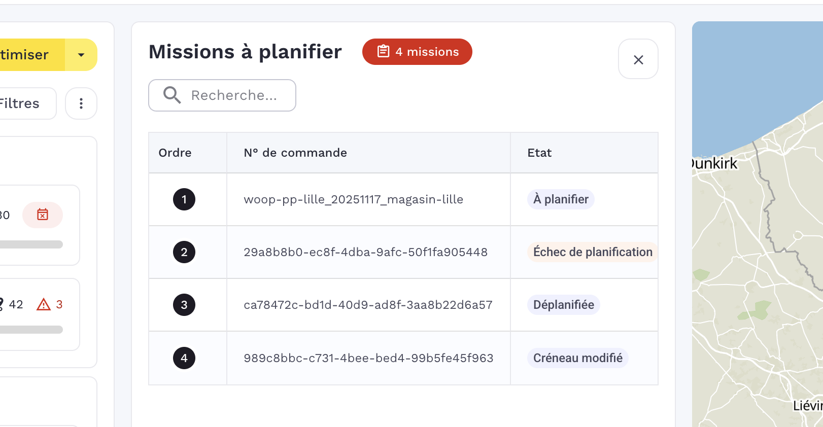 - Rechercher une mission à planifier : Le champ de recherche vous permet de retrouver une mission par n° de commande, Etat, Nom ou prénom du client, créneau horaire, Adresse de livraison.