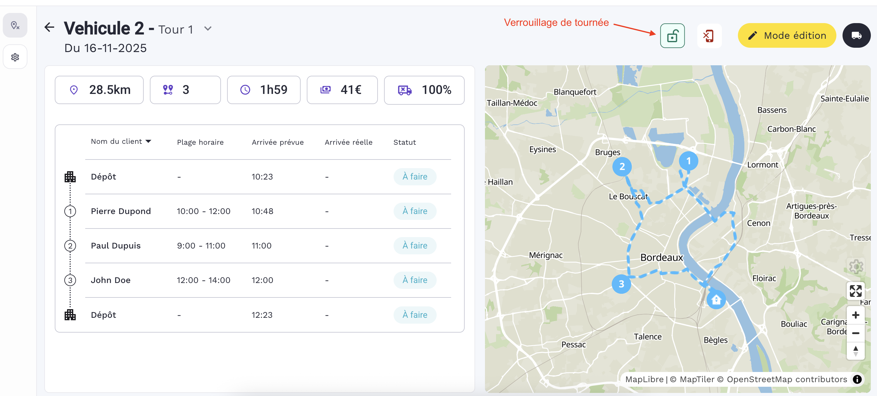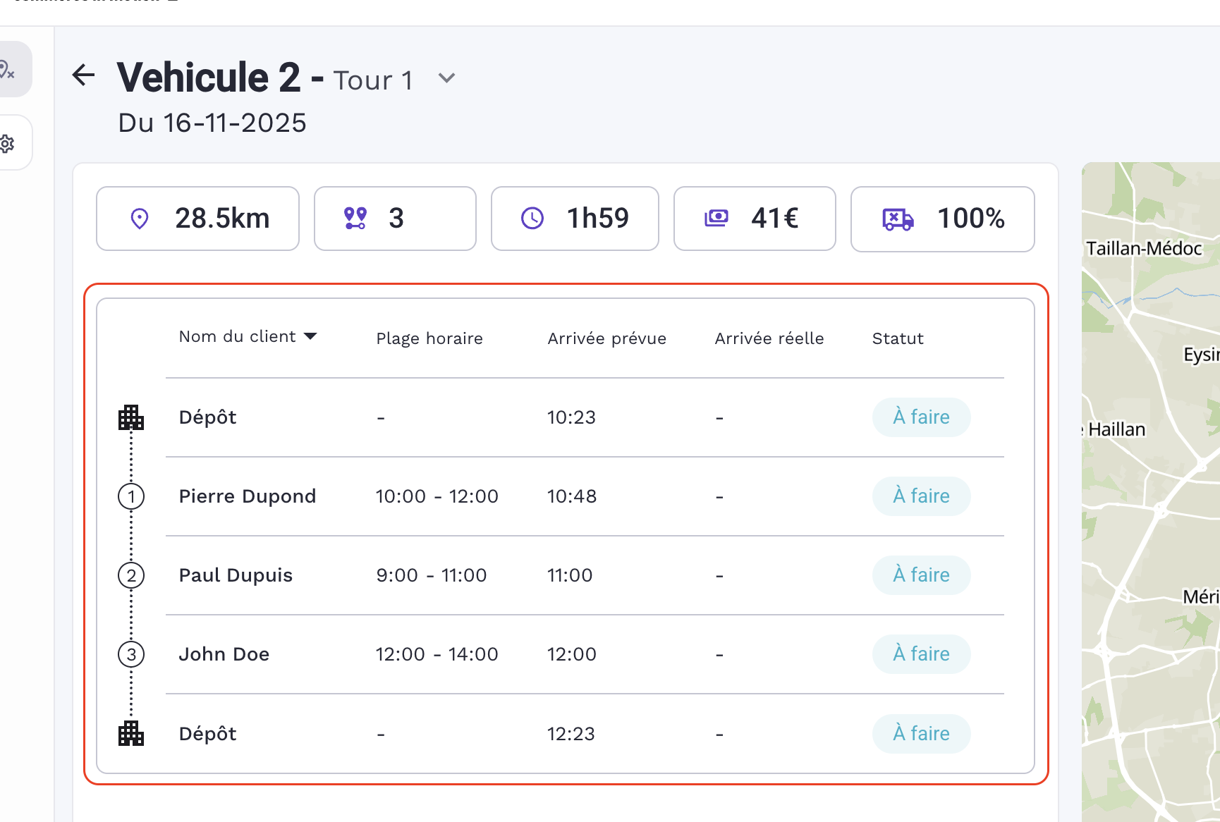 La liste des arrĂȘts reprend l'ordre de la tournĂ©e dĂ©fini par l'optimisation signalĂ©s par le nom du client, la plage horaire (crĂ©neau de livraison choisi par le client), l'heure prĂ©vue.Â