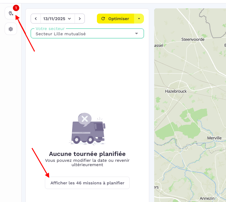 Par défaut, la section "Missions à planifier" s'aligne automatiquement sur la date sélectionnée dans votre bloc "Tournée".