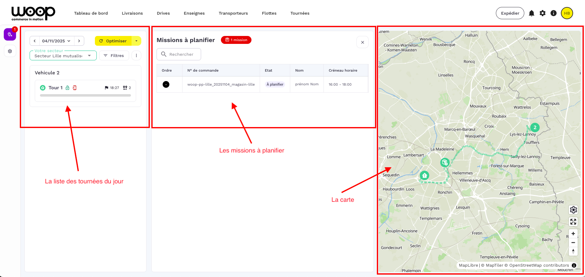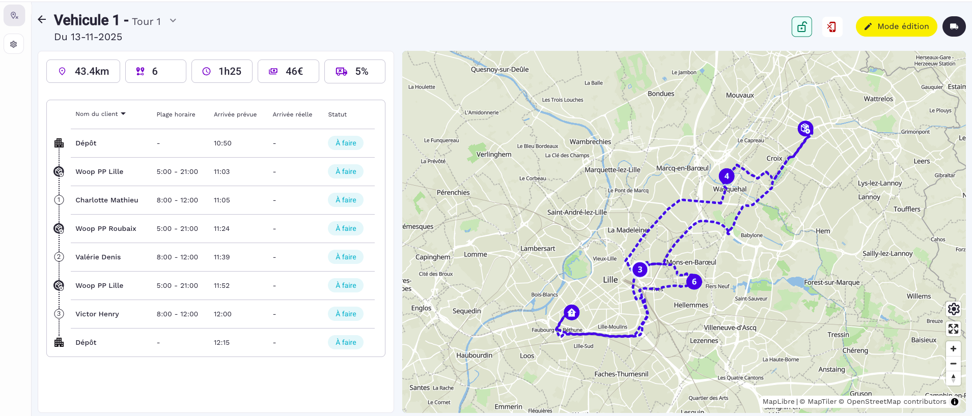 Cette interface offre une visibilitĂ© sur l'Ă©tat de vos tournĂ©es en temps rĂ©el, ainsi que sur vos missions Ă planifier, permettant ainsi de planifier votre journĂ©e plus facilement.Â