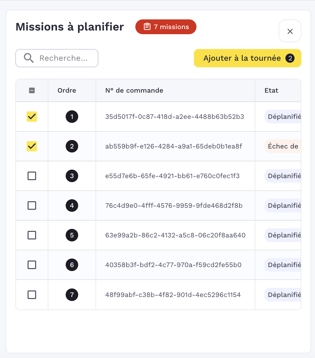 Modification globale : Si vous changez la date de la "TournĂ©e", la liste des missions Ă planifier est mise Ă jour instantanĂ©ment pour correspondre Ă cette mĂȘme journĂ©e.
