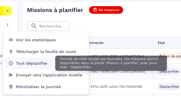 Tout dĂ©planifier : Permet de vider entiĂšrement les tournĂ©es du jour , en cliquant sur le bouton "tout dĂ©planifier" , l'ensemble des missions se retrouverons dans la partie " missions Ă planifier" dans l'Ă©tat "DĂ©planifiĂ©e"Â