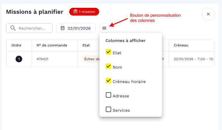 Personnalisation des colonnes :  Vous pouvez adapter le tableau des "Missions à planifier" selon vos besoins en utilisant le bouton de personnalisation des colonnes (situé à droite du sélecteur de date).