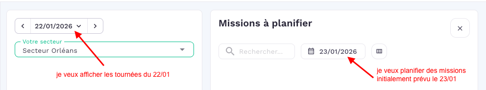 Exemple : "Je consulte mes tournées du 22/01, mais je souhaite afficher les missions à planifier du 23/01 pour les avancer."