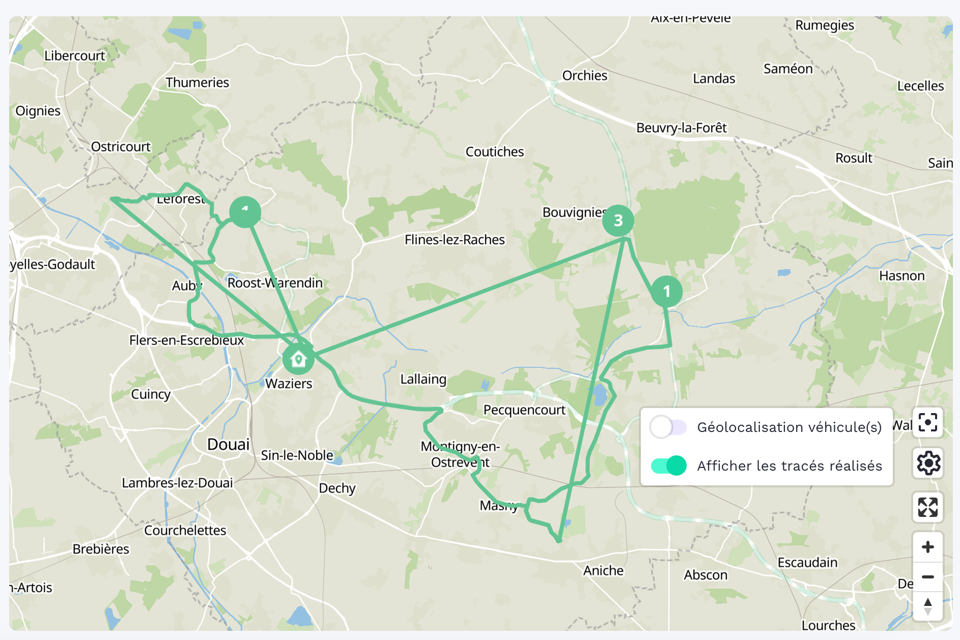 Le tracé réalisé : permet d'afficher en temps réel l'itinéraire réellement parcouru par le véhicule durant sa tournée. Il s'active via l'icÎne de paramétrage (roue crantée) située sur la carte.