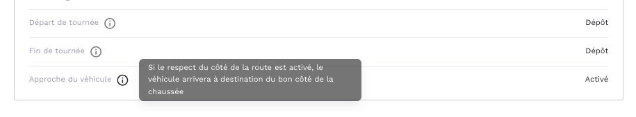 Grace à cette option vous pouvez optimiser vos tournées sans faire demi-tour et vous pouvez choisir si vos véhicules doivent toujours arriver du bon côté de la chaussée.