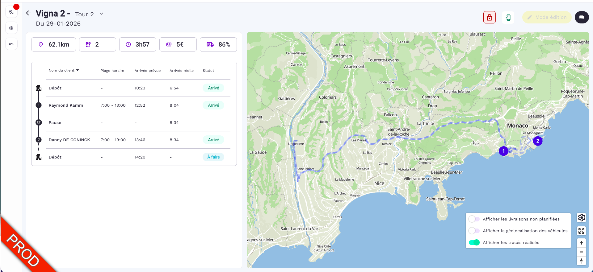 TracĂ© rĂ©alisĂ© : Visualisez sur la carte le chemin rĂ©ellement empruntĂ© par le vĂ©hicule pendant sa tournĂ©e (Disponible si lâoption est activĂ©e sur la map).Â