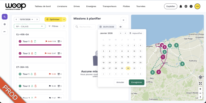 Planification multi-dates: PossibilitĂ© de planifier dĂšs aujourdâhui des missions prĂ©vues pour les jours suivants directement sur les tournĂ©es du jour.