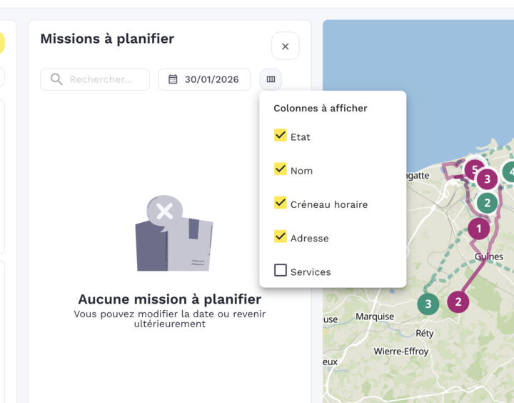 Personnalisation des colonnes du menu "mission à planifier": Chaque utilisateur peut désormais adapter sa vue métier. La sélection des colonnes est sauvegardée par session pour éviter toute reconfiguration répétitive.